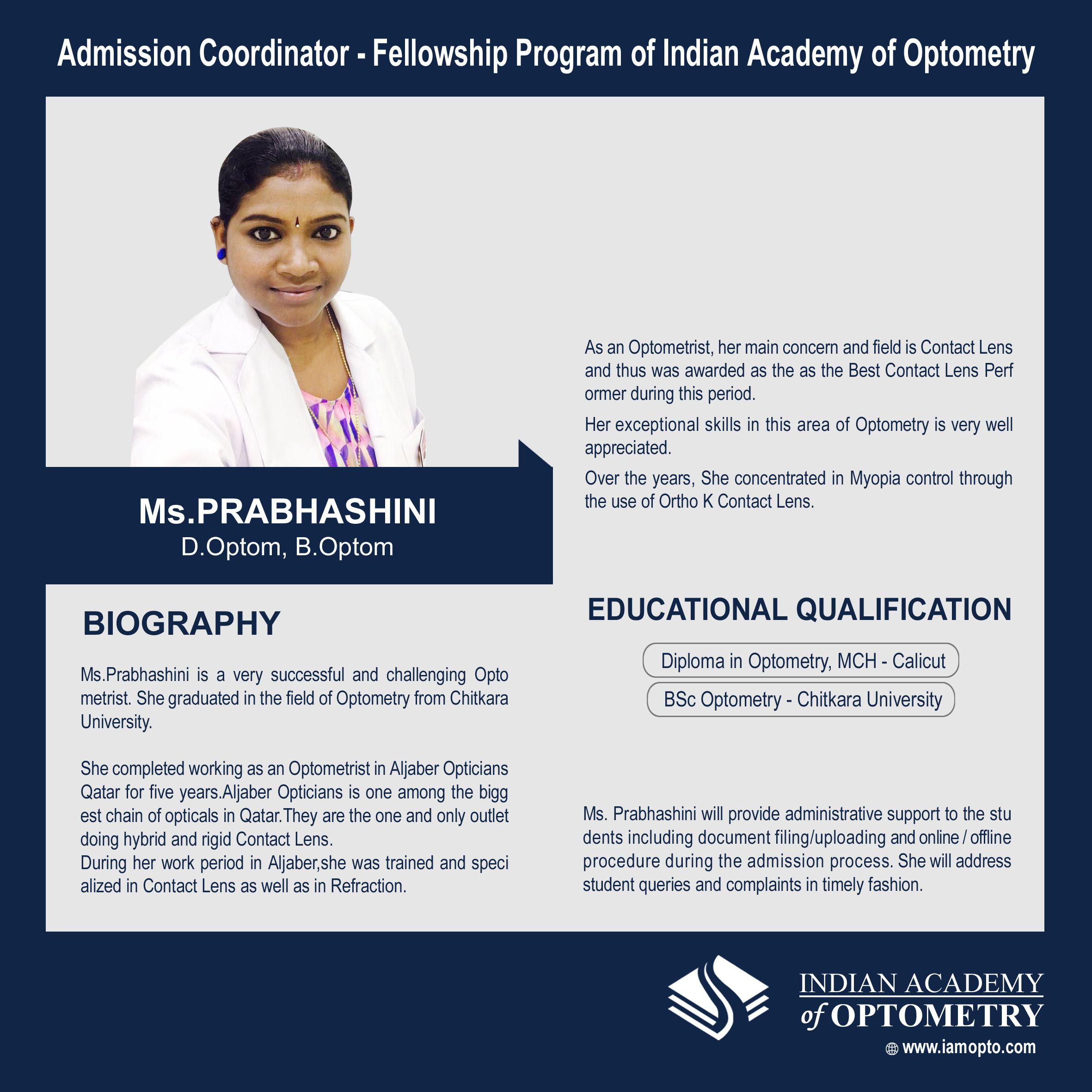 The Indian Academy of Optometry is an Online Optometry Academy. Its goal is to enhance and maintain excellence in optometric practice by both fostering research and disseminating knowledge in vision science. The optometry field is constantly changing.The Academy recognizes that optometrists must receive quality continuing education and the most current information about vision science research.
